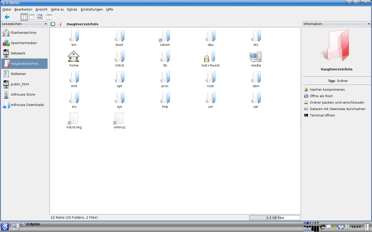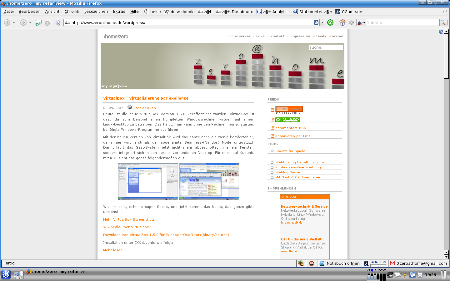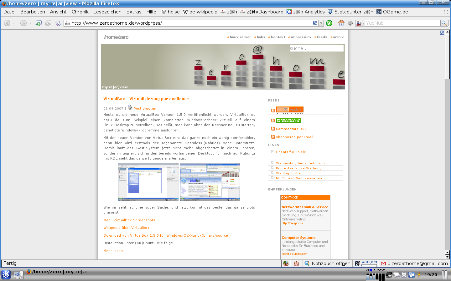 Danach mit Strg-Alt-Backspace den X-Server neustarten und das Ergebnis begutachten. Bei mir hat sich dadurch nichts an den Schriftgrößen getan, deshalb habe ich meine Werte einfach mal mit 1,5 multipliziert (also 1,5*304=452 und 1,5*190=270), also dem X-Server vorgemacht mein Monitor wäre 45,2x27cm groß, und siehe da, die Schriften sind deutlich kleiner und ich mag meinen Desktop noch ein Stück mehr 😉 . Als Beweis hier ein paar Bildchen: